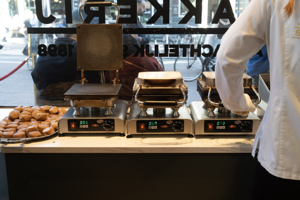 こちらのお店では焼き立てのストロープワッフルも食べることができます。この写真のような焼き機で目の前で焼いてくれます。