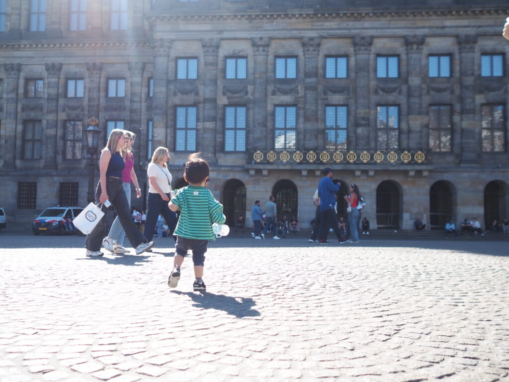 オランダは自転車大国。あちこちで自転車がすごいスピードで走っているので、子供を歩かせるのに気をつかう国ですが、ダム広場内は自転車がいないので、子供を走り回らせることができました。
