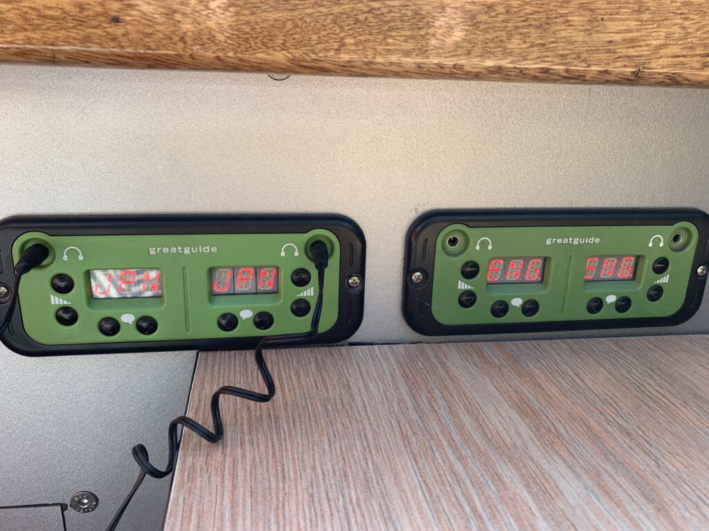 席にはこのような機器が付いており、乗船時に渡されるイヤホンを差すと、ボートが通過するタイミングでそのエリアの解説を聞くことができます。解説は色々な言語で準備されており、なんと日本語もありました!