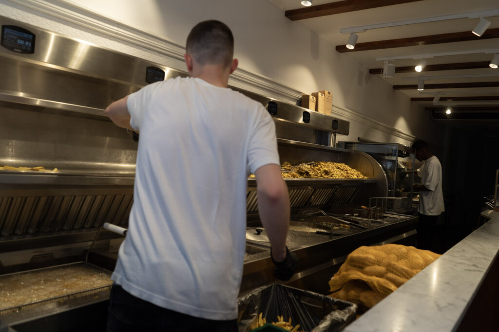 店内では店員さんがひたすら豪快にポテトを揚げ続けています…!