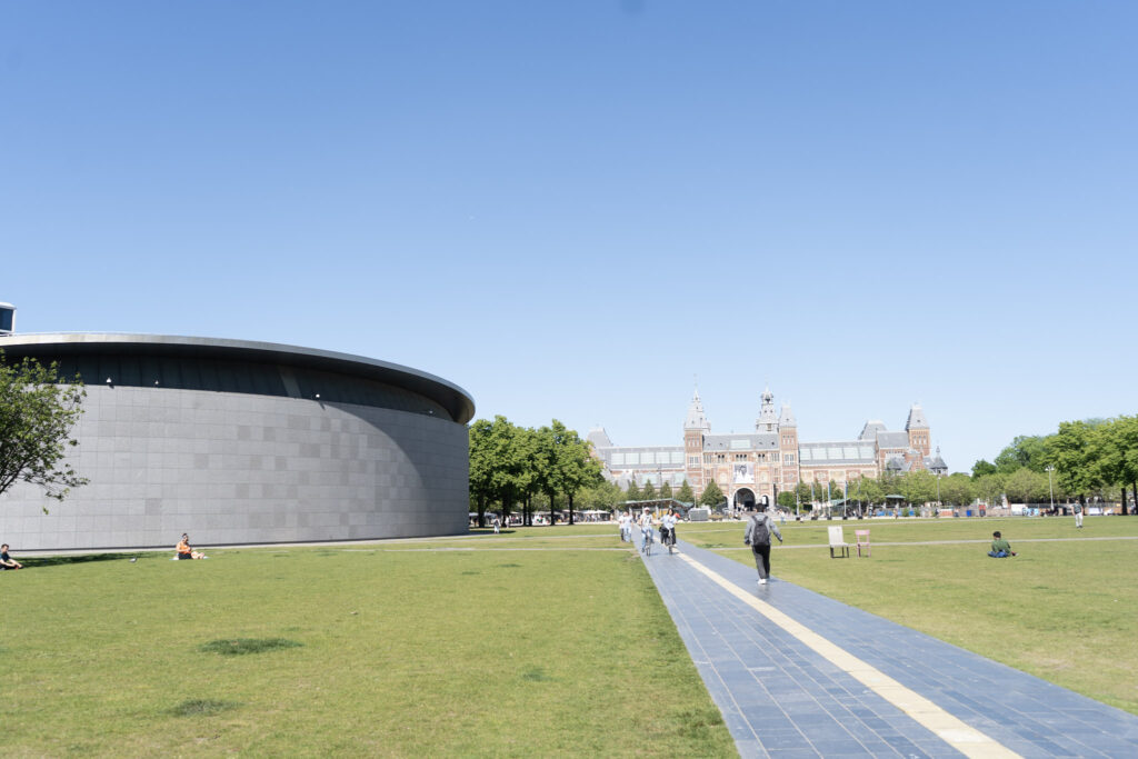 写真の左にある円形の建物がゴッホミュージアムで、奥にある立派な建物が国立美術館です。