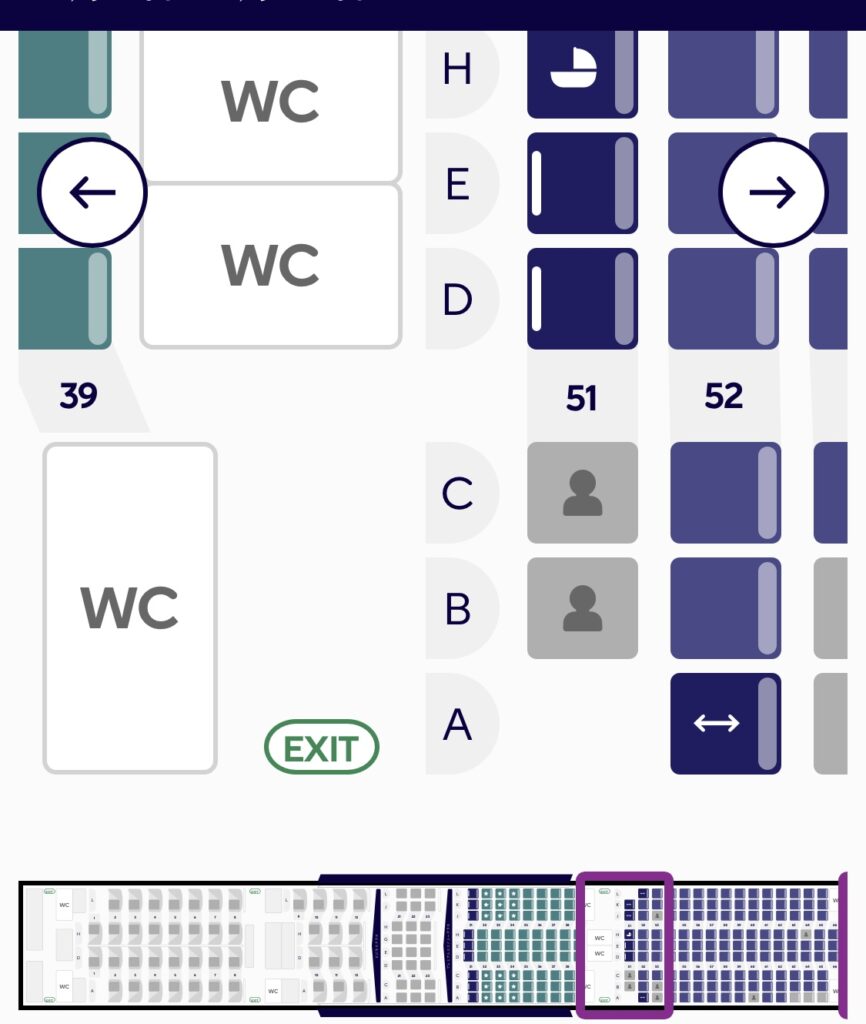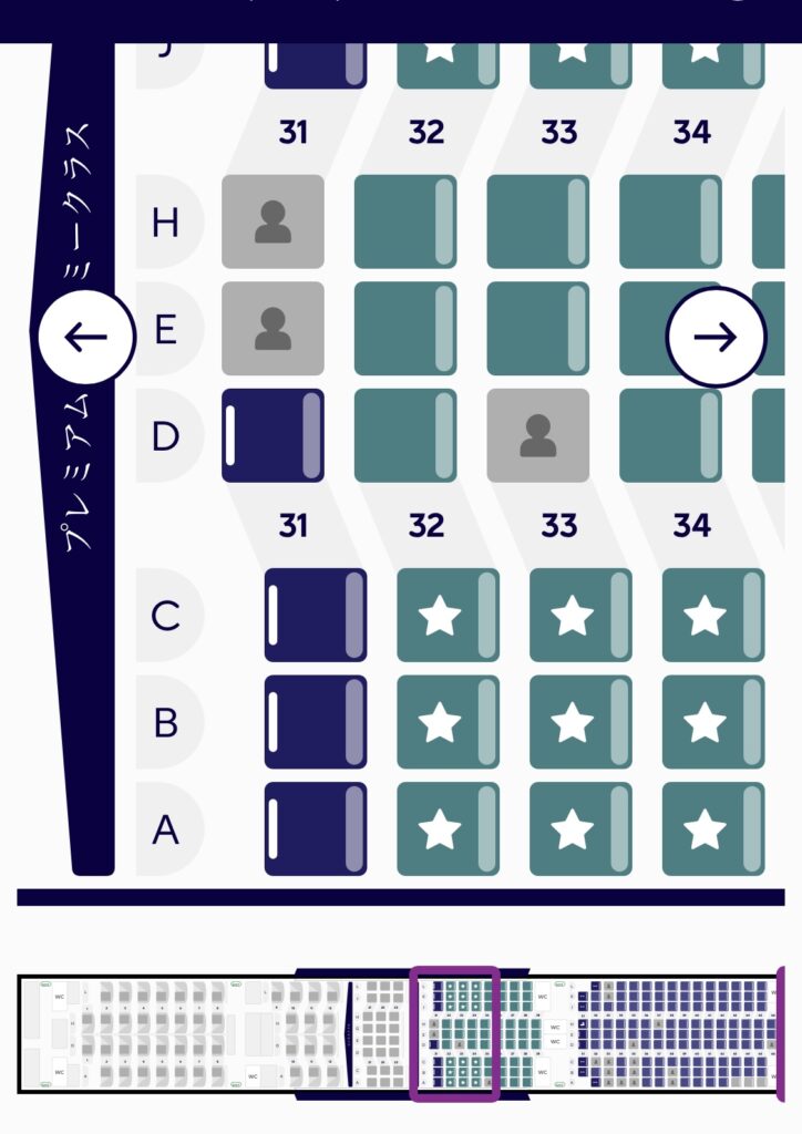 筆者は、エコノミーの中でも最前列、足元が広い席を課金して予約しました!(下図の31列AとBです)